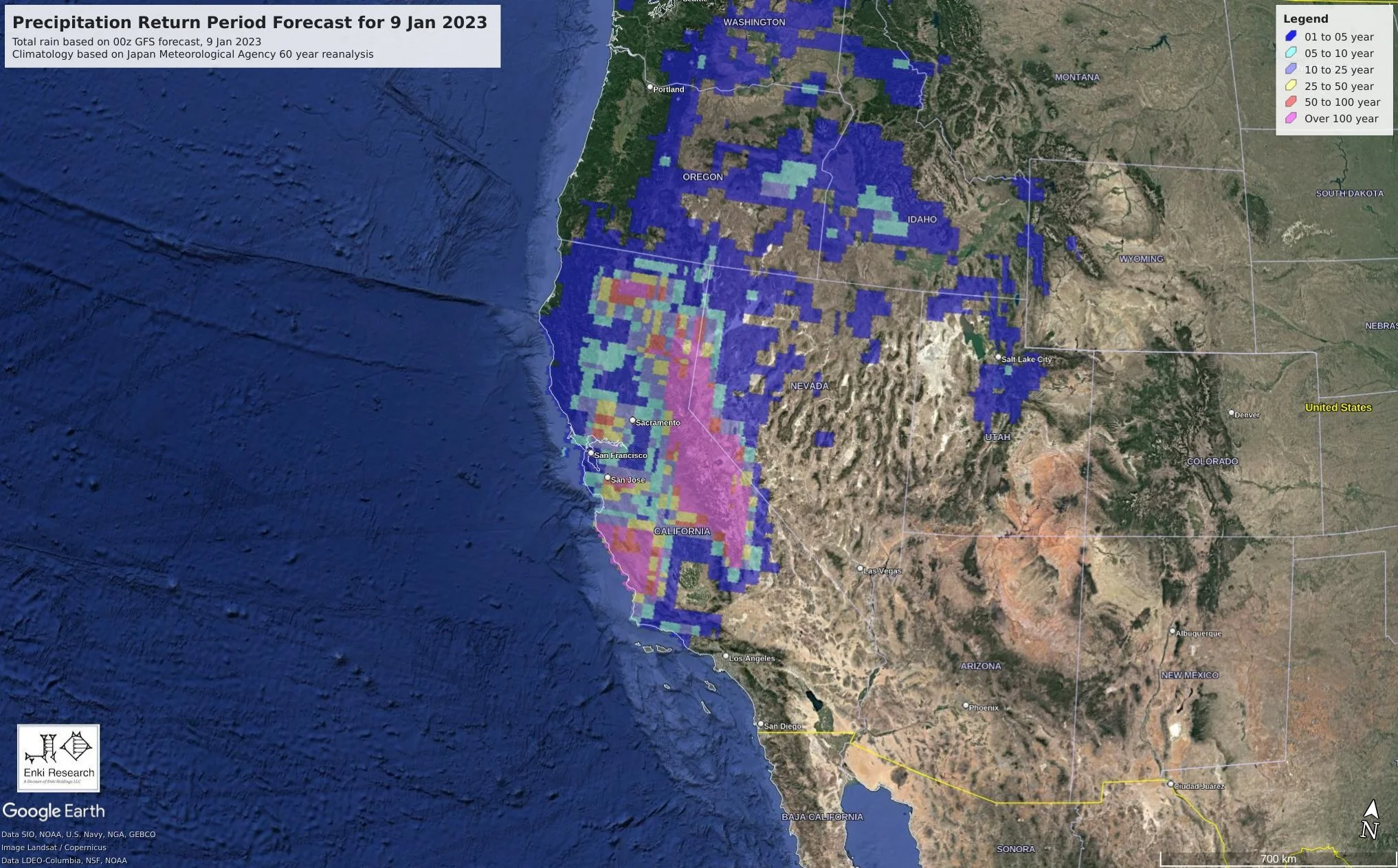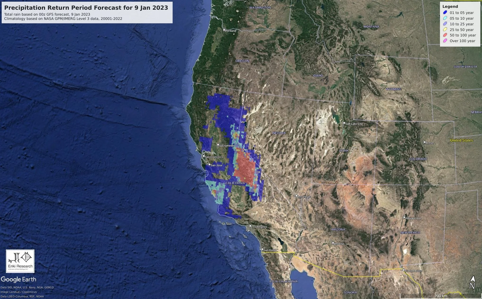 We know the atmospheric rivers pummeling California are generating huge amounts of rain. I’ve seen many images and data showing rainfall amounts, but not much information that presents the precipitation amounts in terms of return periods. (Precipitation accounts for both solid and liquid phases of H2O, e.g., snow and rain.) This post examines precipitation in terms of return periods and focuses on the spatial distribution of precipitation on January 9, 2023. Assessing precipitation forecasts in terms of return periods can provide situational awareness and insights into the potential impacts from excessive precipitation.