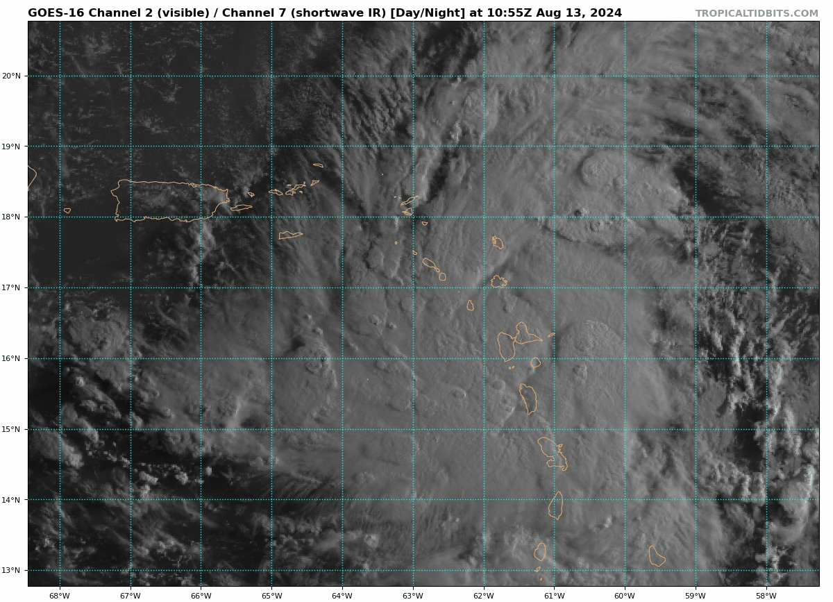 Visible satellite imagery of Tropical Storm Ernesto on Aug 13, 2024, as it passed over the northern Leeward Islands. Imagery borrowed from: https://www.tropicaltidbits.com/sat/