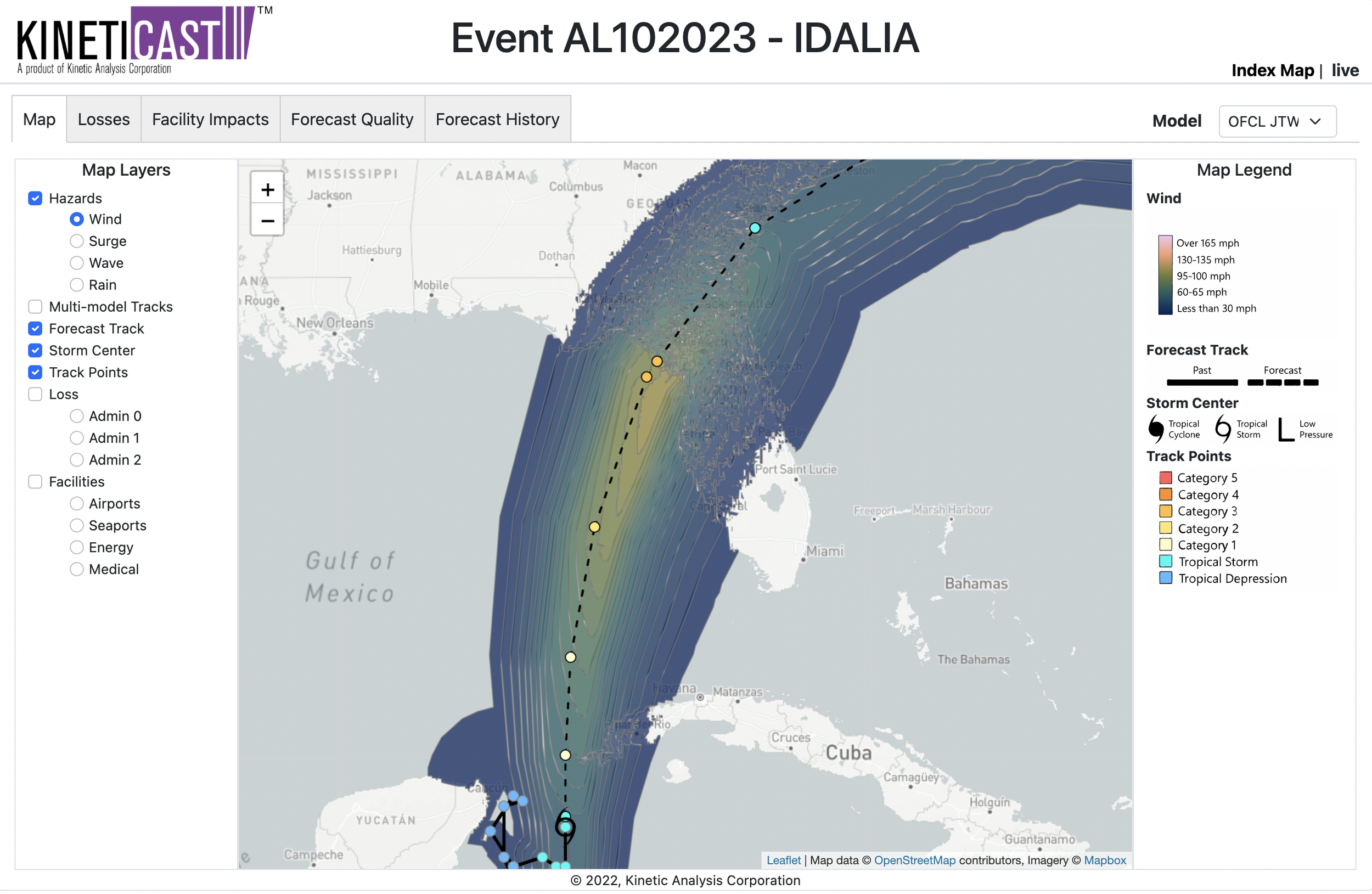 Tropical Storm Idalia, born out of the western Caribbean over the weekend, is poised to make a significant landfall somewhere along the west coast of Florida. As of the latest advisory from the National Hurricane Center, Idalia had maximum sustained winds of 65 miles per hour. It is predicted to strengthen into a hurricane later today and a major hurricane (category 3 or higher) by Tuesday night into Wednesday morning. The latest forecast wind graphic from KinetiCast™ is displayed below: