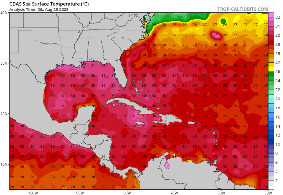 Figure 2: Sea surface temperatures (in degrees Celsius) for the western Atlantic and Gulf of Mexico as of 06 UTC on August 28.