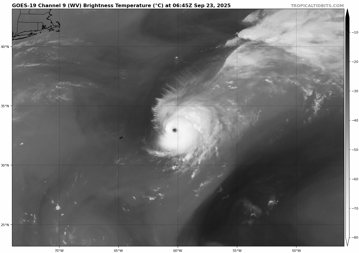 Figure 1: Water-vapor satellite imagery of Category 4 Hurricane Gabrielle moving northeast in the Atlantic Ocean. Note the spinning area to the south of Gabrielle (upper-level low) and the upper trough to the northeast, both enhancing storm outflow.