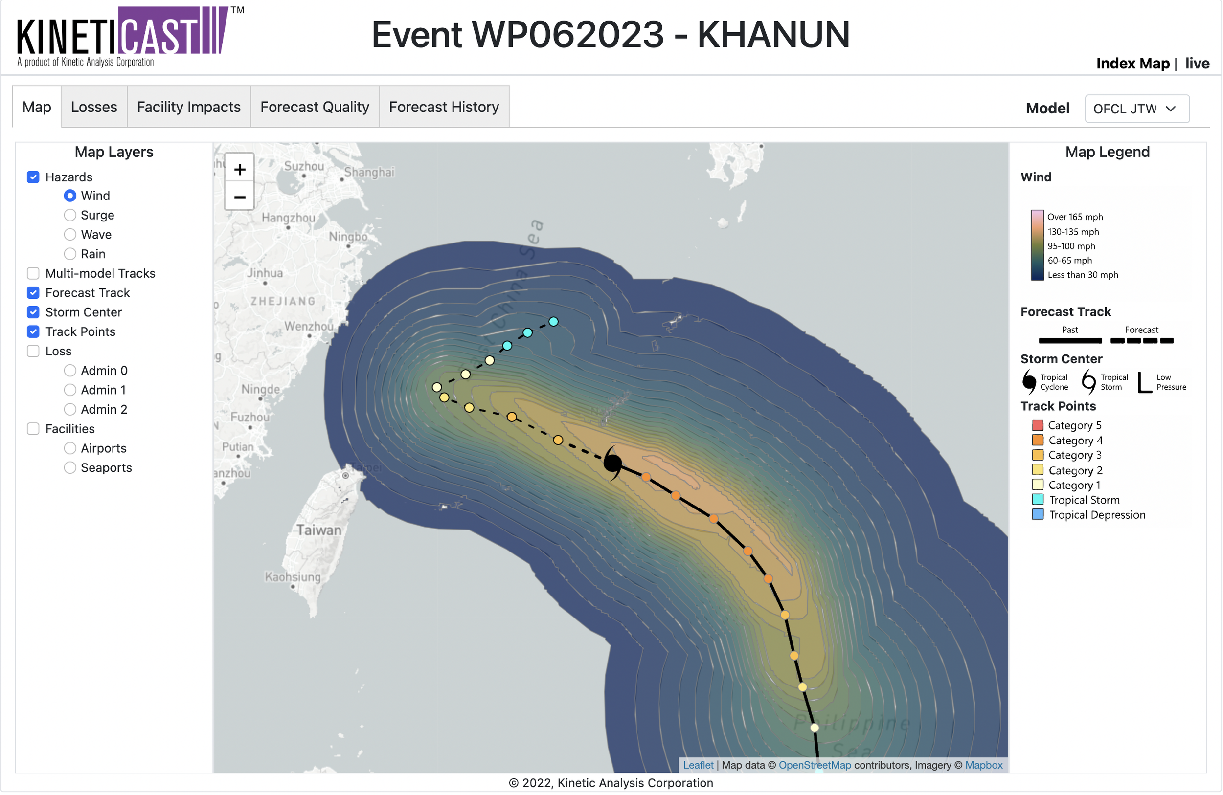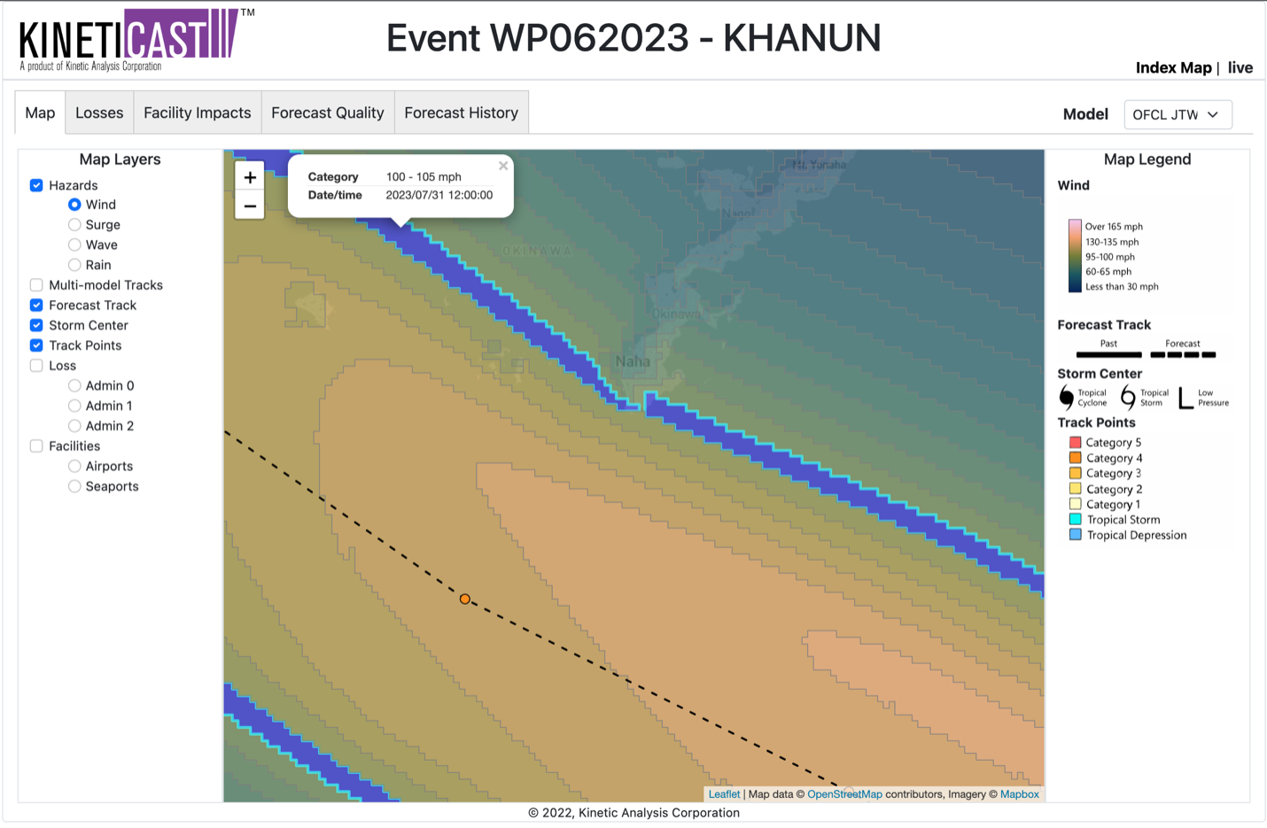 Figure 1: Projected wind swath of Typhoon Khanun, generated by KinetiCast™ models using forecast data from the Joint Typhoon Warning Center (JTWC). The solid hurricane symbol denotes the storm position for this forecast. The filled circles are color-coded by intensity. The circles on the dashed line represent the forecast position of the cyclone at 12-hour intervals, and the circles on the solid line depict the past position of the storm at 6-hour intervals.